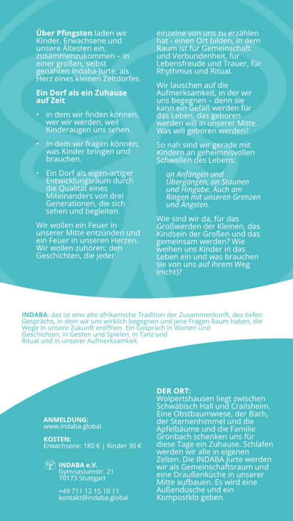 Über Pfingsten laden wir Kinder, Erwachsene und unsere Ältesten ein, zusammenzukommen – in einer großen, selbst genähten Indaba-Jurte, als Herz eines kleinen Zeltdorfes.